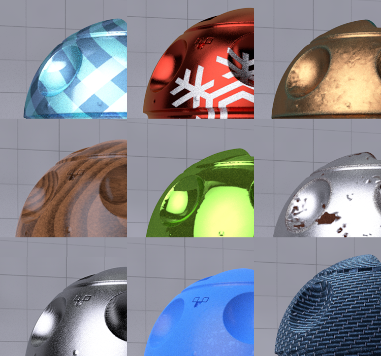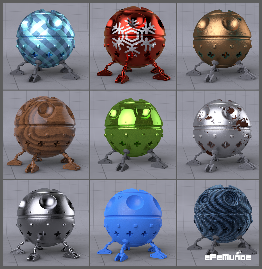 Descarga estos nueve materiales realistas de Cinema 4D, creados con el canal reflectancia. Madera, metal desgastado, anisotrópico, plástico, oxidado, patrón, bola de navidad con estrella y desgastado. Todos ellos creados sin texturas, solo con elementos procedurales.