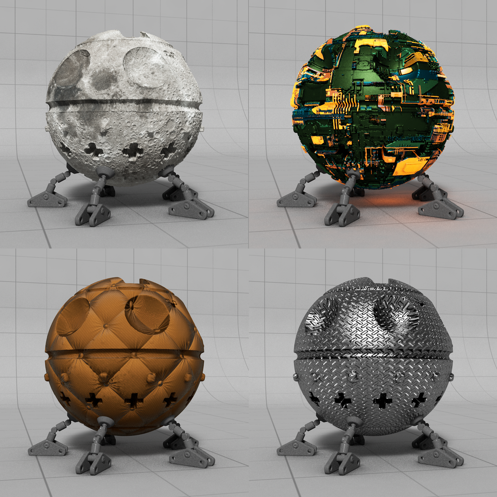 4 materiales de Cinema 4D. Luna, sofá, metal y "tech".